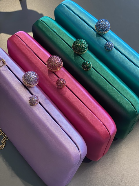 Pochette clutch in raso, chiusura con calamita e decoro gioiello con strass coordinate nel colore.
