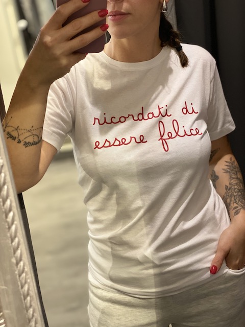 T-shirt 100% cotone taglio classico, morbida e lunga.