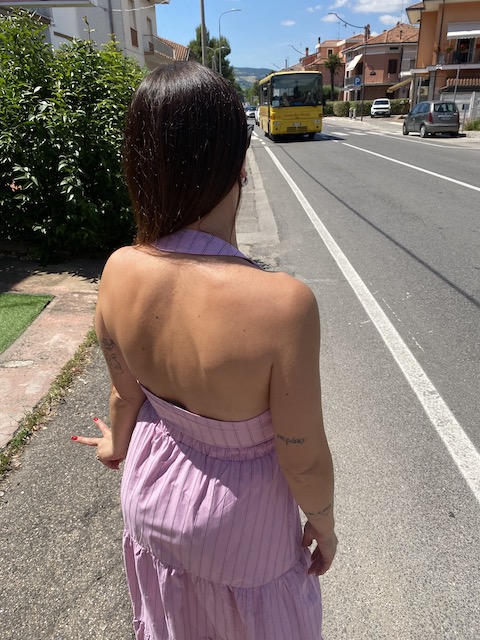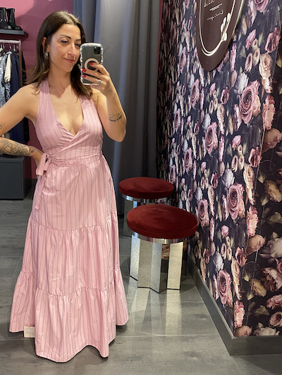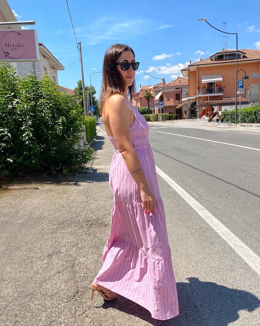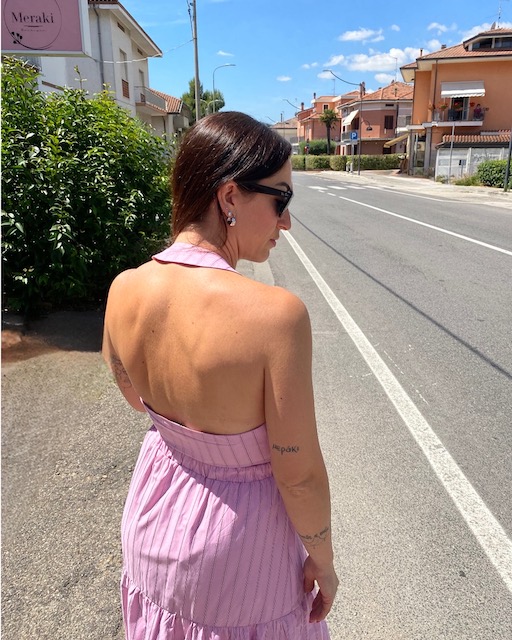 Top a triangolo con chiusura a scaldacuore. Fantasia a righe verticali. Si abbina perfettamente alla gonna NINA.