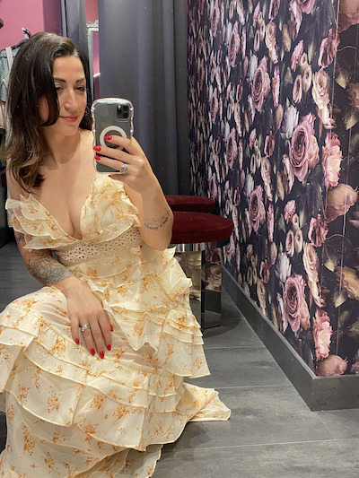Abito lungo a balze con dettaglio pizzo in vita, scollo a V e bretellina fina.