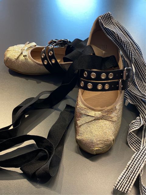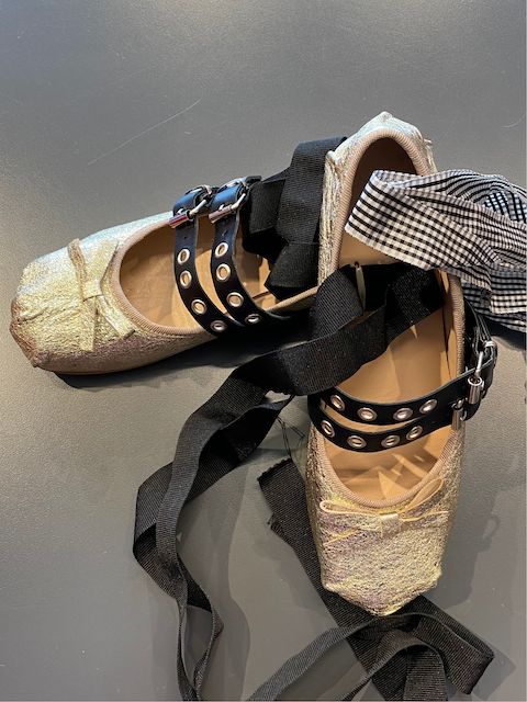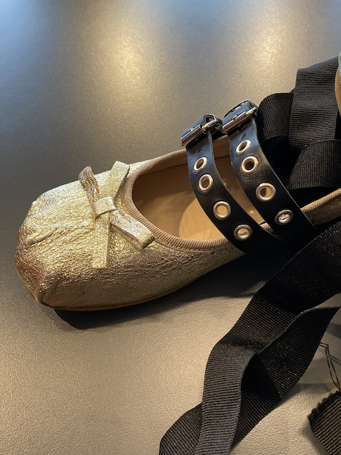 Dettaglio dei cinturini in pelle sopra il collo del piede e la possibilità di utilizzare i nastri per la caviglia. Già presenti nella scatola due lacci in tessuto: uno vichy bianco e nero e uno in grosgrain nero. Intercambiabili, la ballerina può anche essere indossata senza lacci in tessuto.