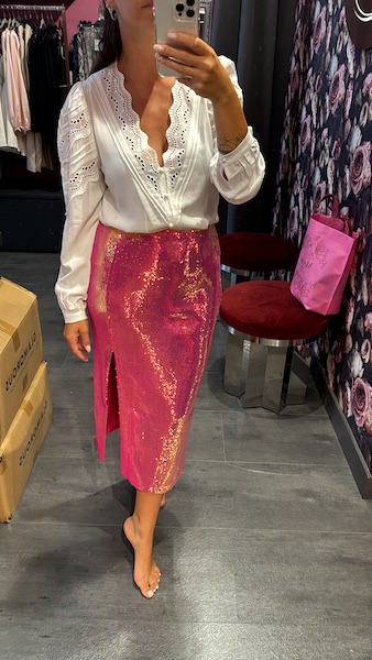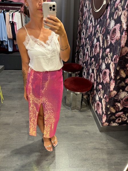 Ricoperta in paillettes camgianti, di base è un fucsia molto acceso, con riflessi giallo, arancio e verde lime.